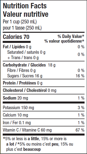 Jus de pomme fait de concentré (eau, jus de pomme concentré), Vitamine C.